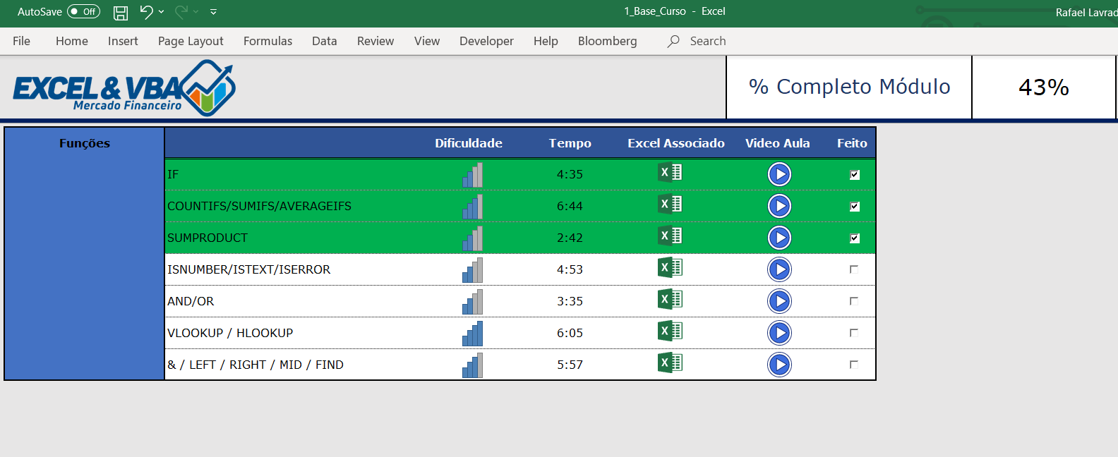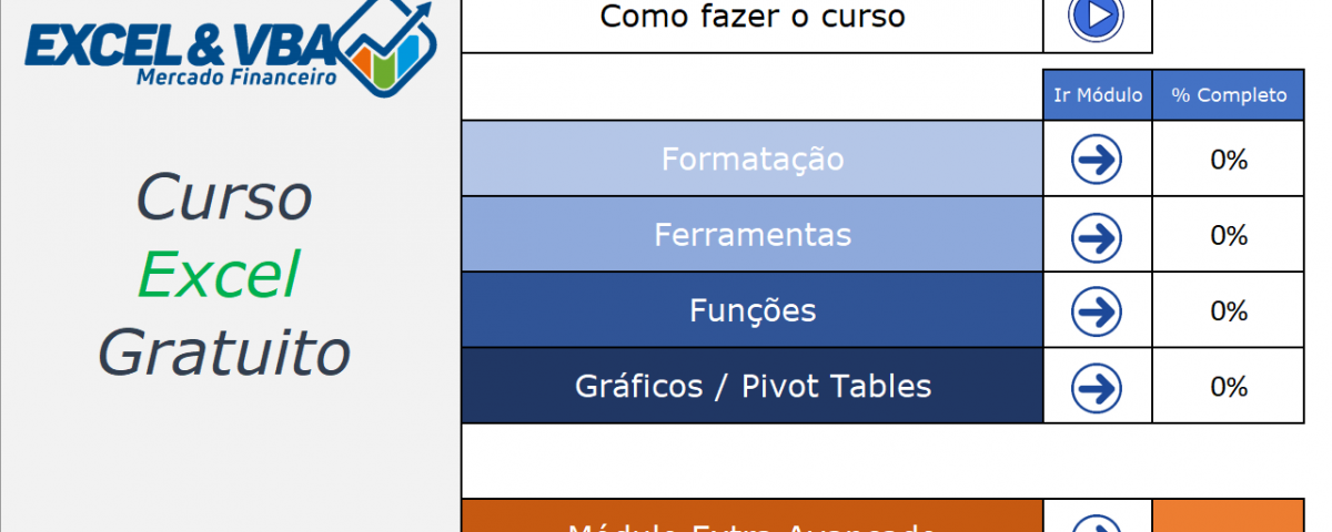 O meu único curso pago é focado no VBA, onde exijo um nível mínimo de Excel para os alunos se inscreverem.